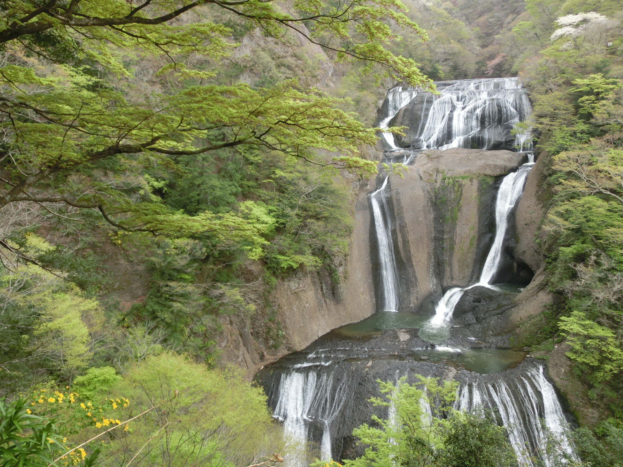 新緑の優しい緑に包まれて水量もまずまず、紅葉の時期は大変な混雑とか、この時期は人も少なく、ゆっくりと滝を堪能することができました。