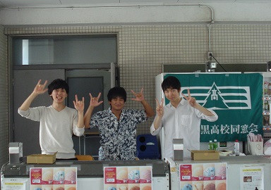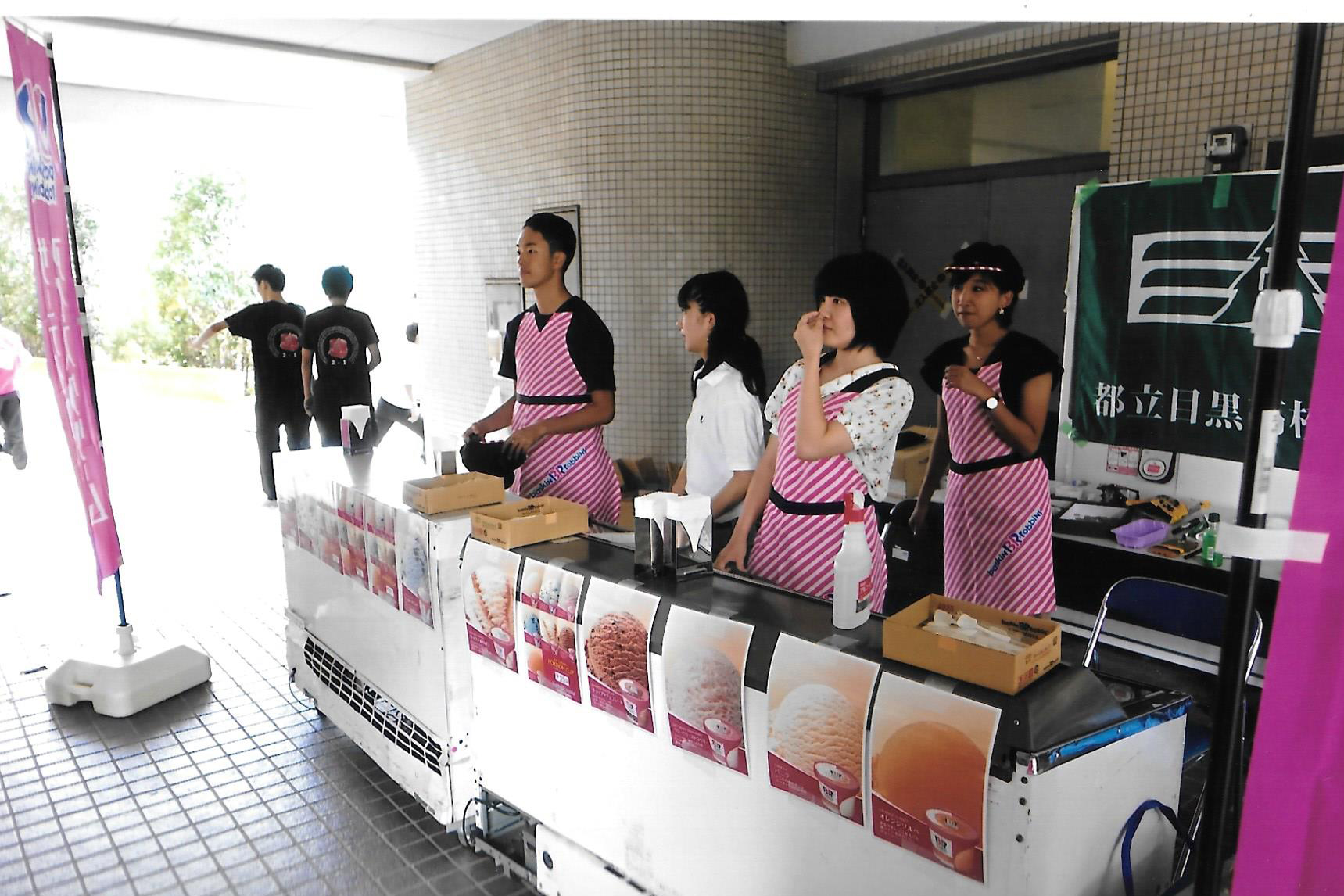 同窓会は毎年母校文化祭に参加・PRしています。アイスクリーム販売は名物にもなり、今年卒業の新幹事が中心となり、1階ピロティにて、2日間合計1,200個のアイスクリームを販売しました。