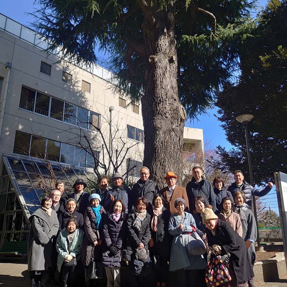 心のふるさと祐天寺を参拝した後、駒沢通りをそぞろ歩き、事前に同窓会を通じて許可を得た母校ヒマラヤ杉の前で記念撮影。